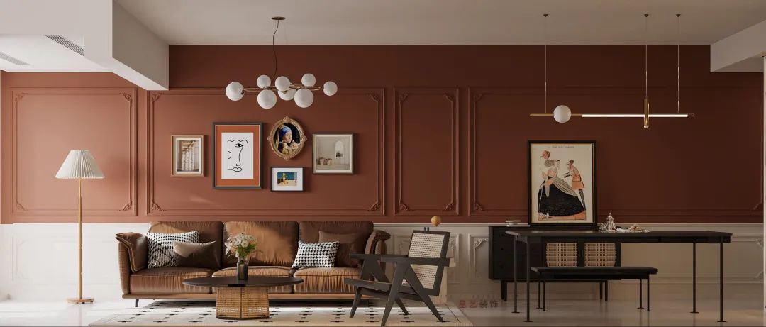 提到法式風格,就繞不開石膏線條元素,大開大放、如火如荼的大繎色塊游走整個客餐區,毫不遮掩展示了主人熱情的性格,同時達到了延伸、整合的作用。